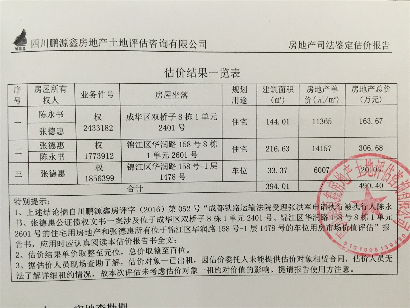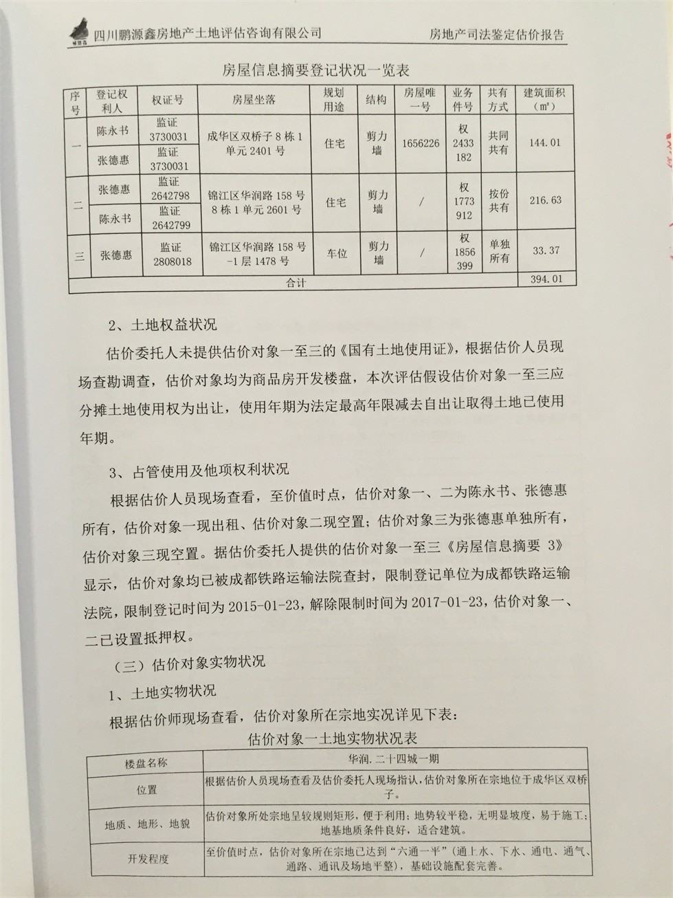 标的2:成都市锦江区华润路158号“翡翠城四期”8栋1单元2601号住宅用房,建筑面积约216.63㎡。参考价:306.68万元,保证金:31万元;锦江区华润路158号“翡翠城四期”-1层1478号车位,建筑面积约33.37㎡。参考价:20.05万元,保证金:2万元。整体拍卖优先,整体拍卖参考价:326.73万元,保证金:33万元。